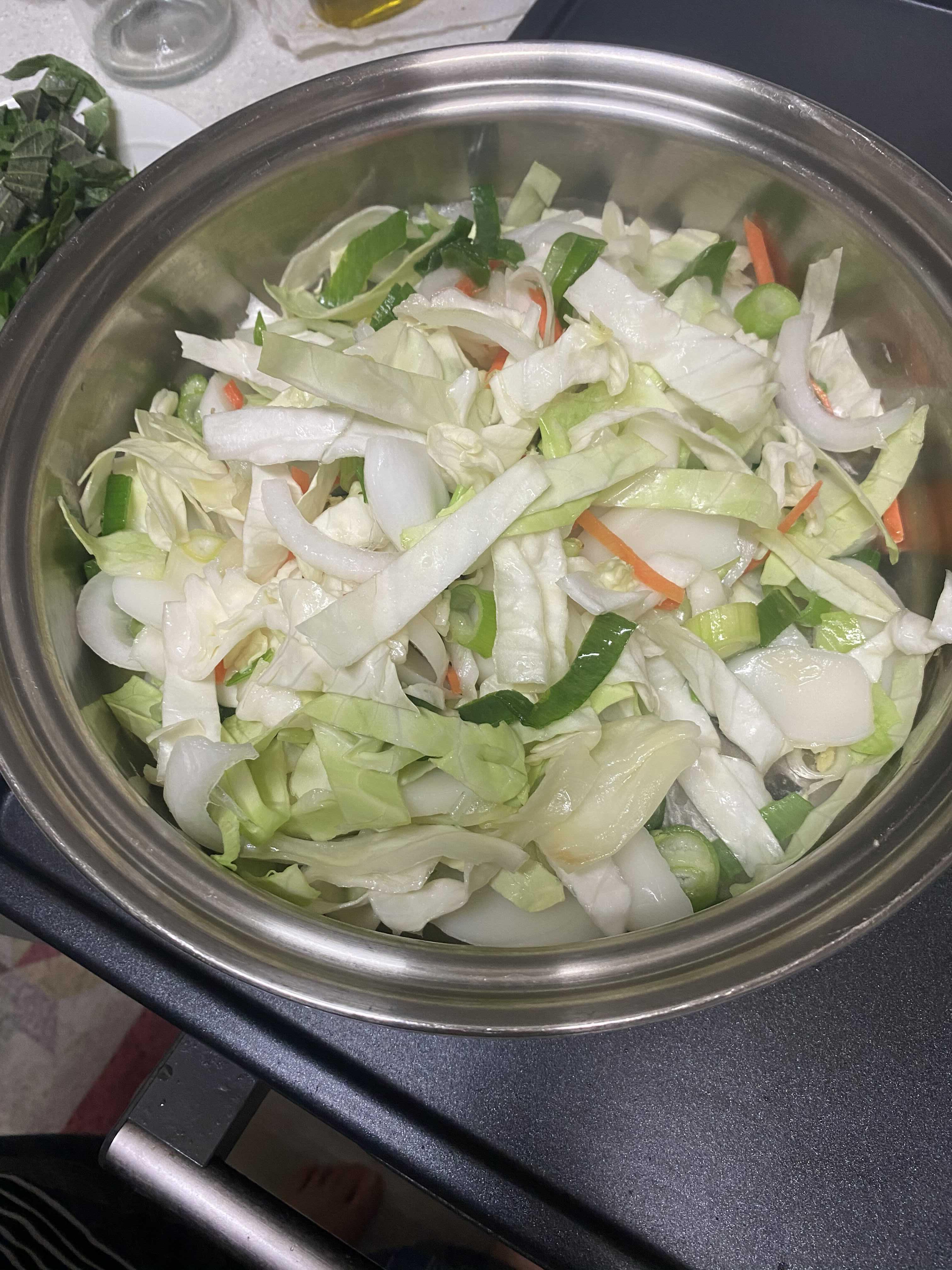 2. 깻잎 제외하고 나머지 야채들을 몽땅 기름에 볶아줍니다: 2~3분